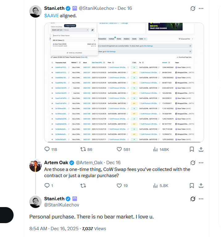 Along with the SEC and masterplan announcement, Kulichov wrapped things up on Tuesday by sharing that he personally purchased $9.8 million worth of AAVE, outside of the US. Proposed buyback of Aave DAO program.
