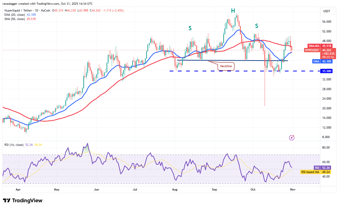 Sellers once again thwarted the bulls’ attempts to push the price of Hyperliquid (HYPE) above the overhead resistance of $51.50 on Thursday. This brought the price down to the 20-day EMA ($43.10).