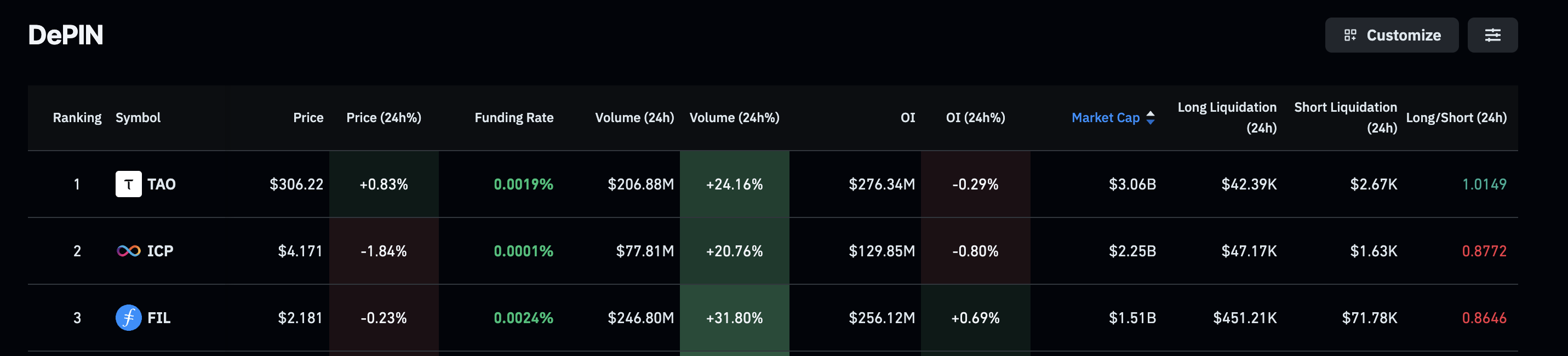 Verify the validity of the audio level, COINGLASS data reveals that trading sizes in BitTensor (TAO), online computer (ICP), and Pilecoin (Fil) have increased by 24 %, 20 %, and 31 % in the past 24 hours, respectively.