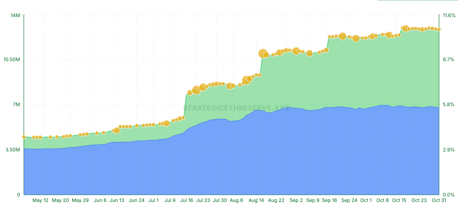 Data from StrategyETHreserve.xyz It indicates that collective holdings of strategic reserves and ETFs have decreased by 124,060 ETH since October 16.