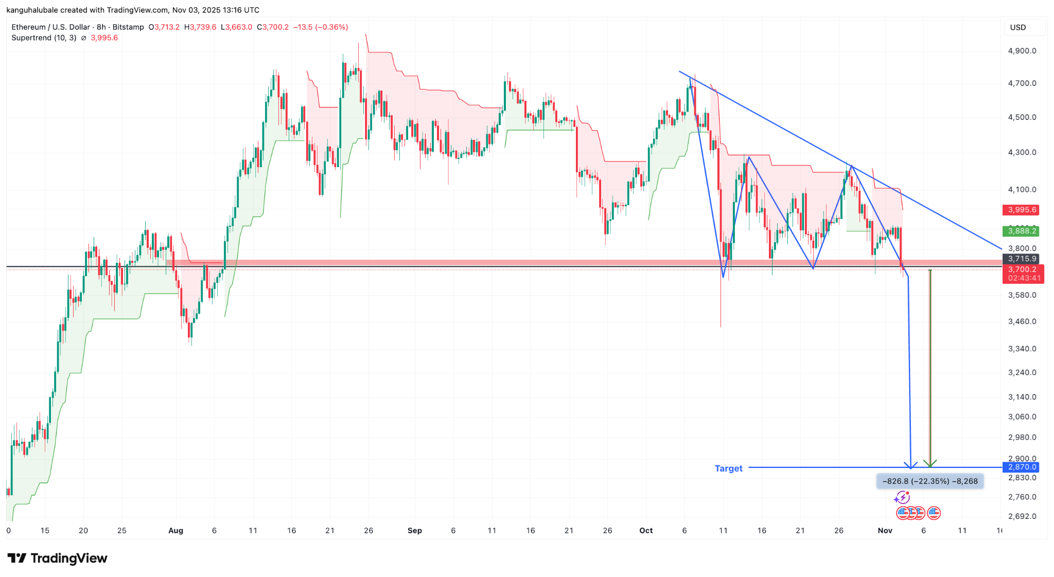 A bearish triangle for Ethereum is displayed on the eight-hour chart, with a price target of $2,870 for Ethereum.