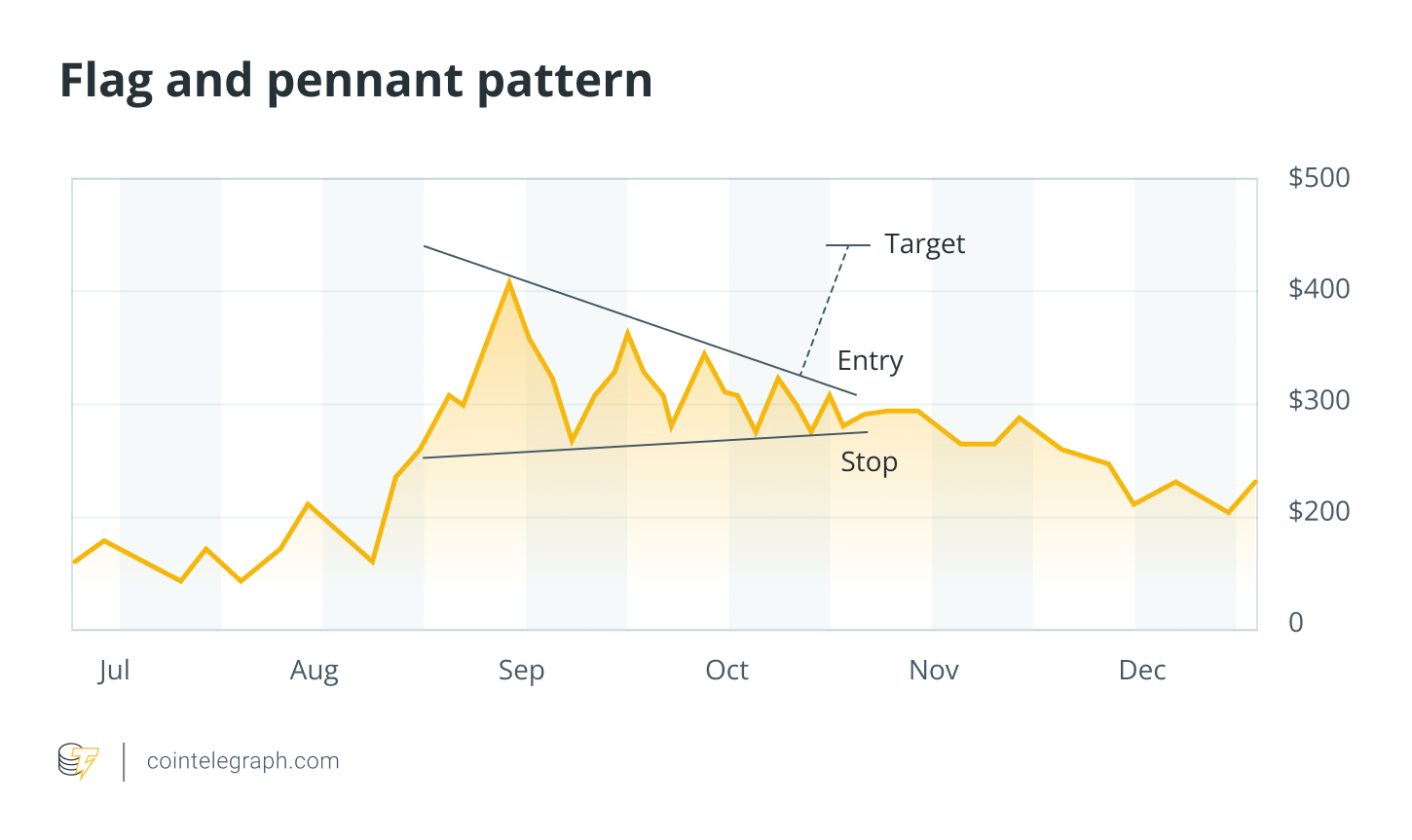 Flag and pennant patterns are formed after sharp price movements. Flags appear as small parallel channels, while banners appear as compact triangles. Both signals pause before the prevailing trend continues.