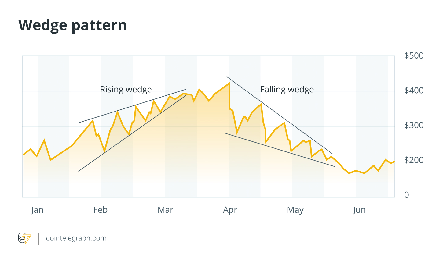 Wedge patterns are formed when price action creates converging trend lines that slope either up (a rising wedge, usually bearish) or down (a falling wedge, usually bullish).