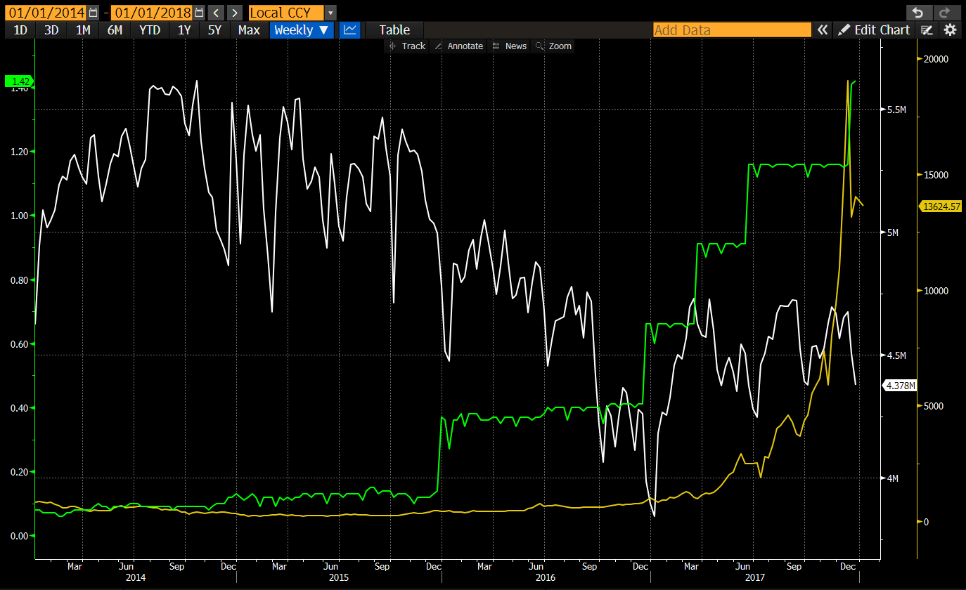 This was an ICO cycle because during this time period the Ethereum mainnet was commissioned and heralded the growth of new issues funded by subscription via the public blockchain using smart contracts. Bitcoin rose from the ashes because the supply of the yuan exploded, not the dollar. As you can see below, China’s credit drive accelerated in 2015 alongside the depreciation of the yuan against the dollar. The supply of dollars decreased and interest rates rose. Bitcoin has risen dramatically due to tons of yuan being traded in global financial markets. Ultimately, as yuan credit growth slowed from the highs of 2015, tight monetary conditions for the dollar sent it into a bull market and hit it flat to the ground by late 2017.