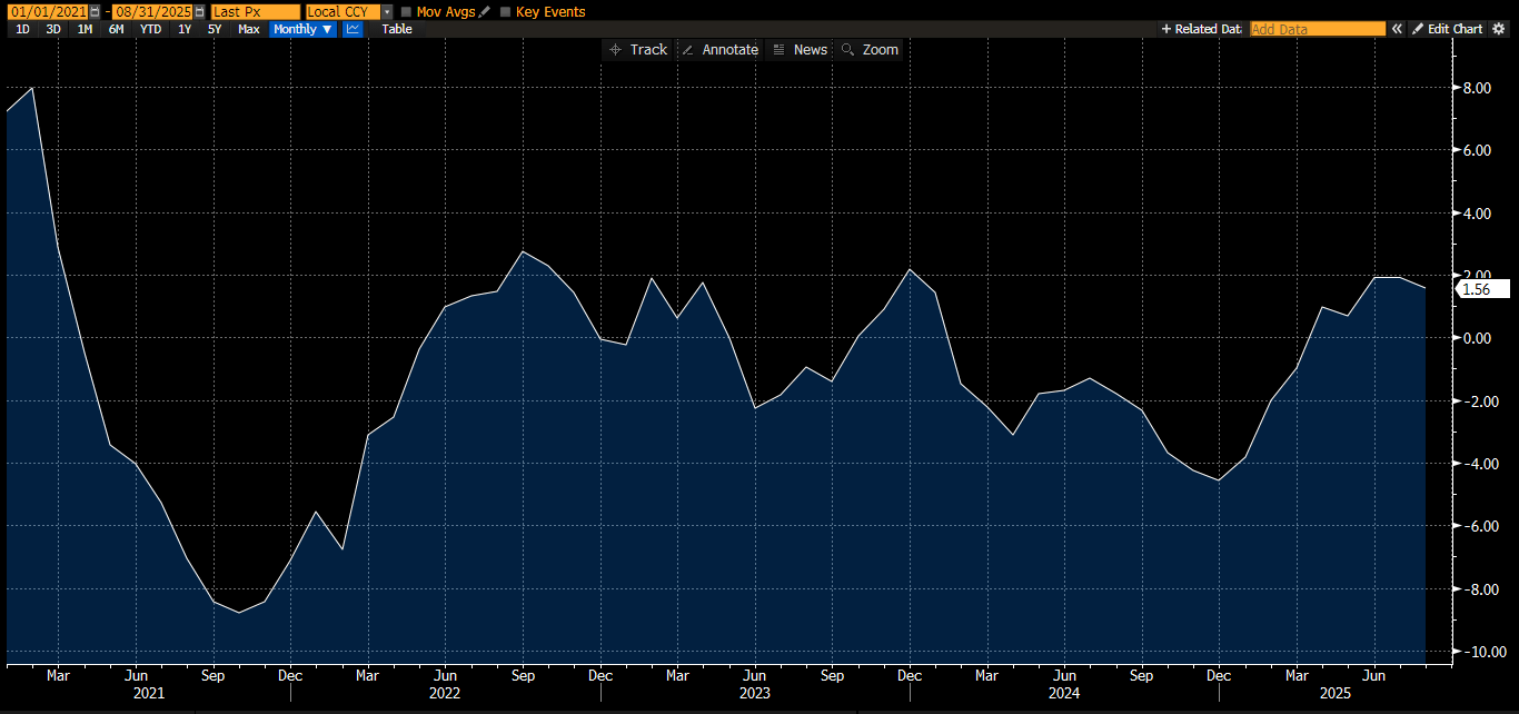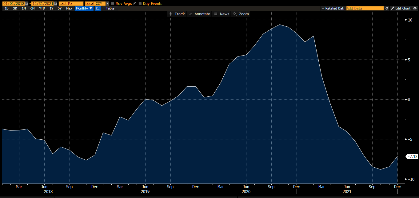 The Chinese economy is more dependent on credit than the US economy, so I used the Bloomberg Economics China Credit Impulse % to 12-month change. You would get a similar chart if you looked at the annual change in nominal GDP.