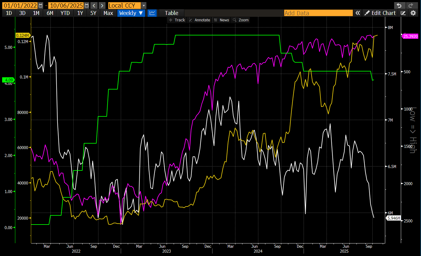 This time, the driver of credit growth came from the Fed’s reverse repo program (SRP in purple with the y-axis reversed). The price of money rose. The supply of money decreased. But Biden needed to stimulate the markets. Therefore, his subordinate, US Treasury Secretary Bad Gur Yellen, issued more Treasury bills than securities/bonds in order to drain the bailout. This has unleashed approximately $2.5 trillion of liquidity into the markets. Her successor, Buffalo Bill Bessent, continued this policy until the suggested retail price fell to its current value near zero. China entered into bouts of deflation as judged by its negative credit impulse. Xi remains committed to reducing housing prices and their importance to the Chinese economy. With no further guidance or changes in the monetary policy outlook for the US and China, I agree with many crypto traders that the uptrend is over. But recent rhetoric and actions by the Federal Reserve and the People’s Bank of China suggest otherwise.