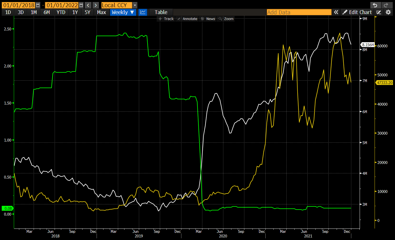 The white line is a measure of the price and supply of credit in dollars. This is a combination of bank reserves held at the Federal Reserve and the total deposits and other liabilities of the US banking system. The Federal Reserve publishes both figures weekly.