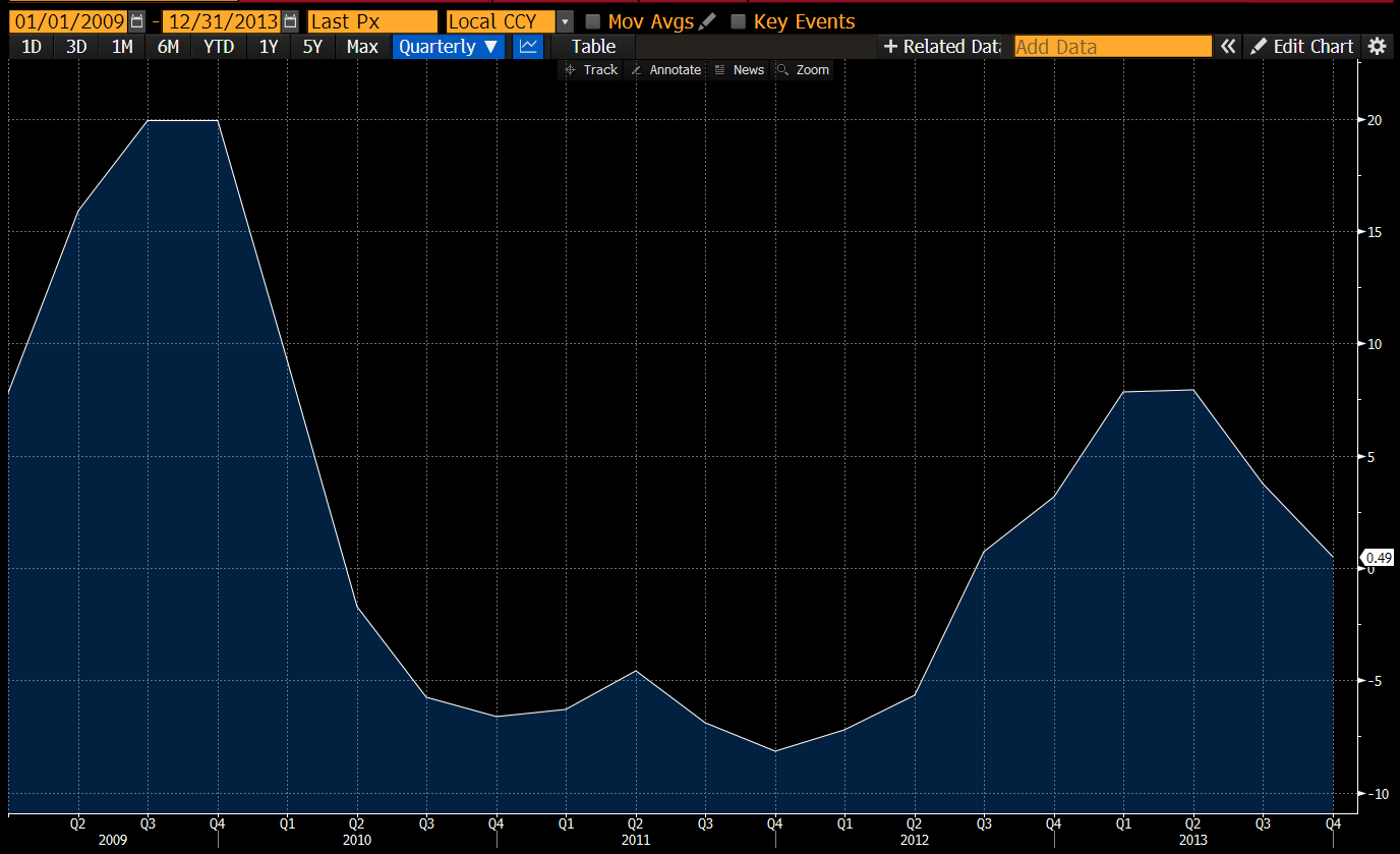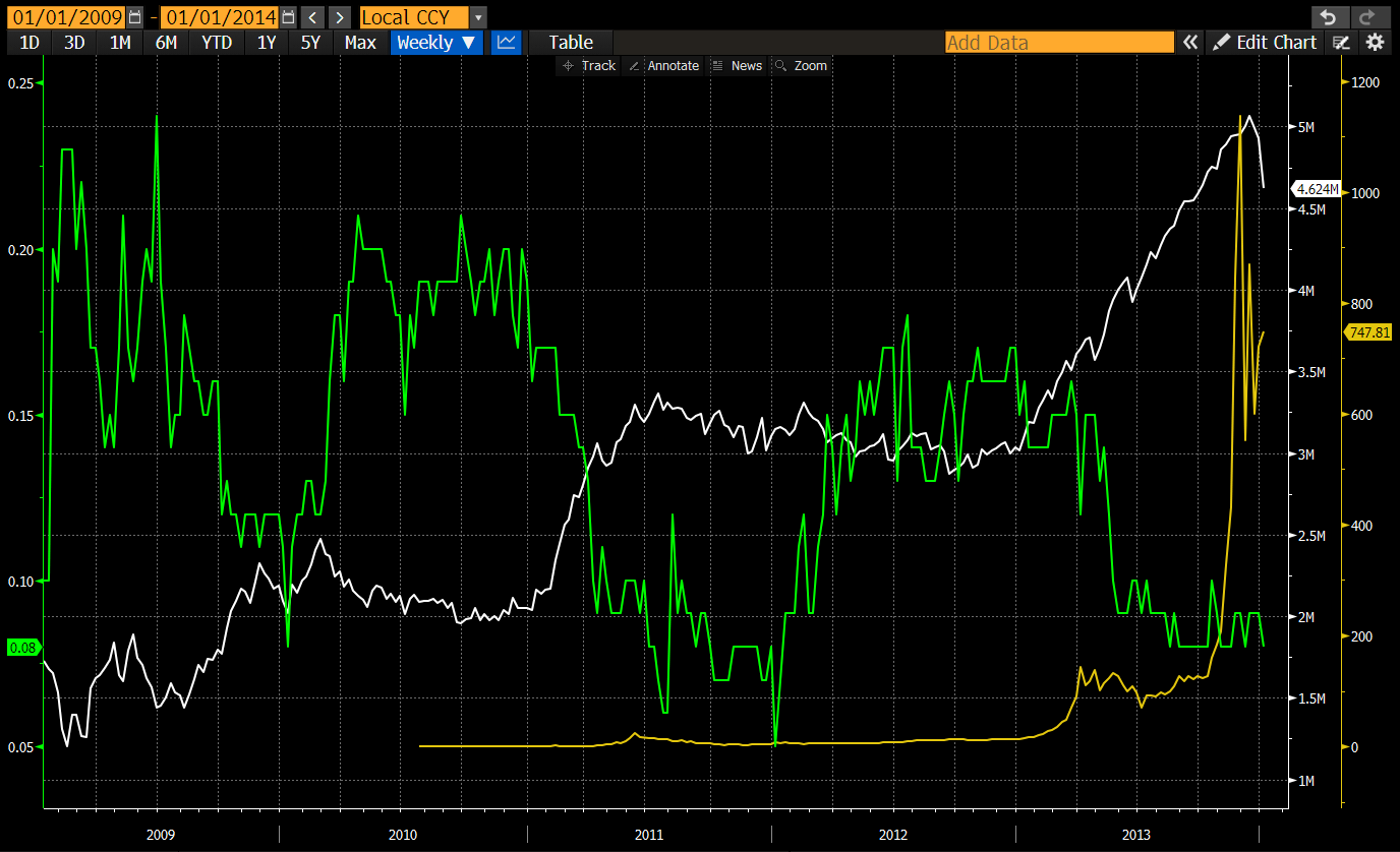 The dollar rate was effectively 0%. The supply of dollars rose sharply, peaking and then declining at the end of 2013.