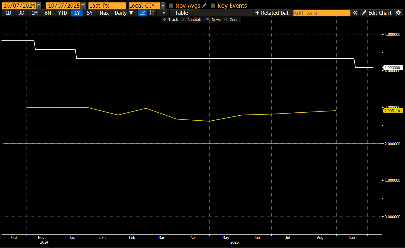 The white line is the actual Fed funds rate, the yellow line is the core PCE rate, and the green horizontal line is the Fed’s 2% target.