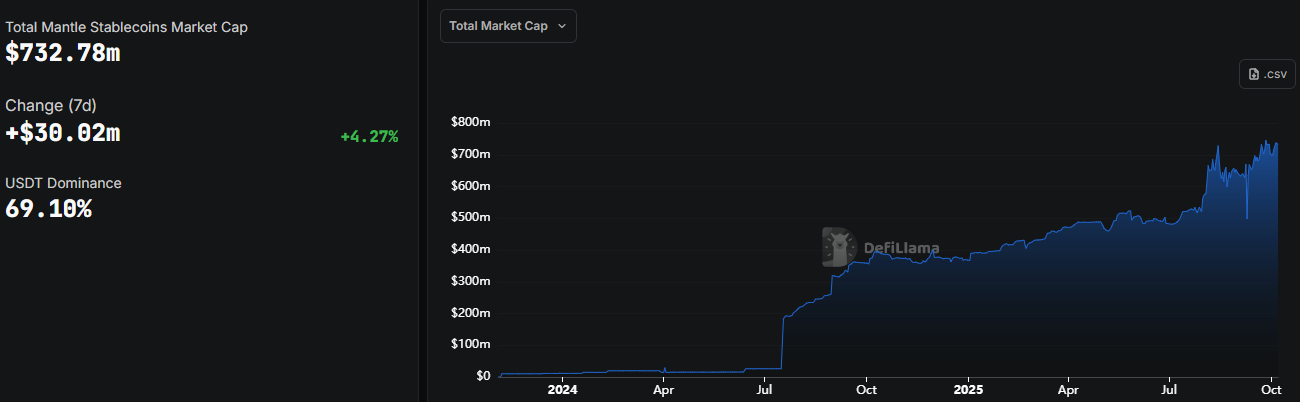 Since then, the network’s StableCoin market cap has risen to $732.78 million, 4.27% from Defillama data, with USDT dominating at 69.1%.