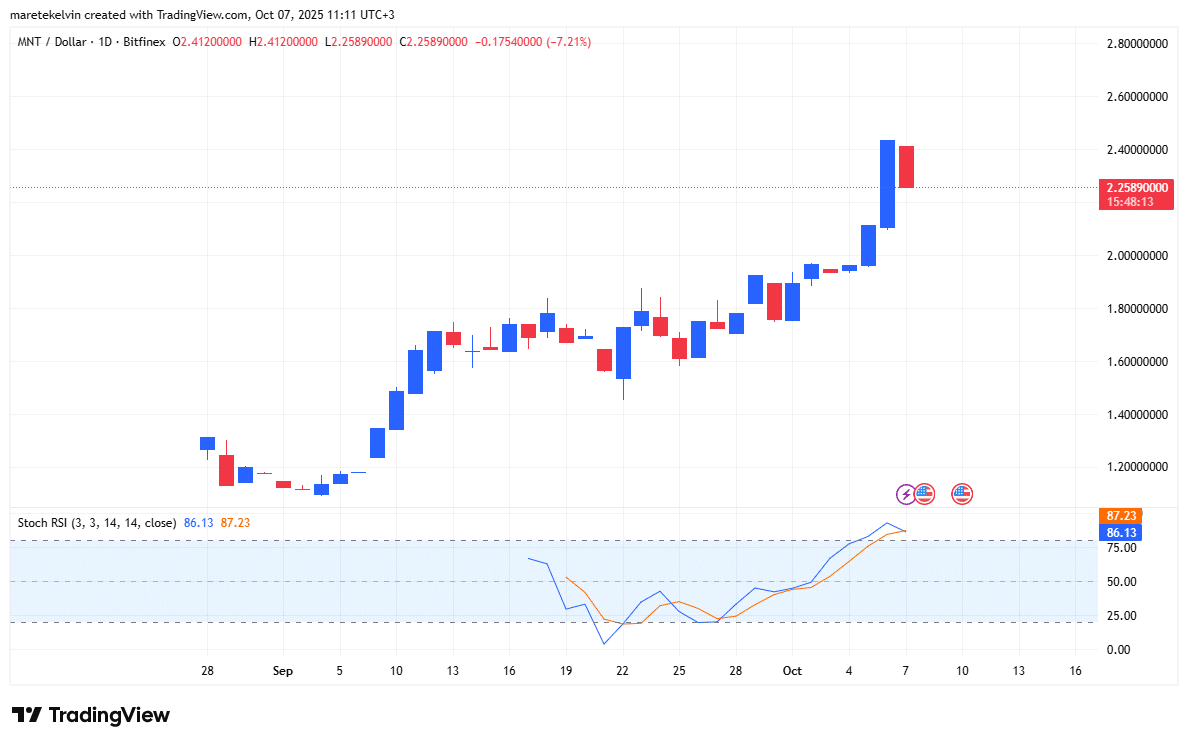 The stochastic RSI on TradingView showed values ​​close to 87, as of writing, deep into the peak zone. After an 11% daily jump, MNT was trading at $2.25, just below its high of $2.41.