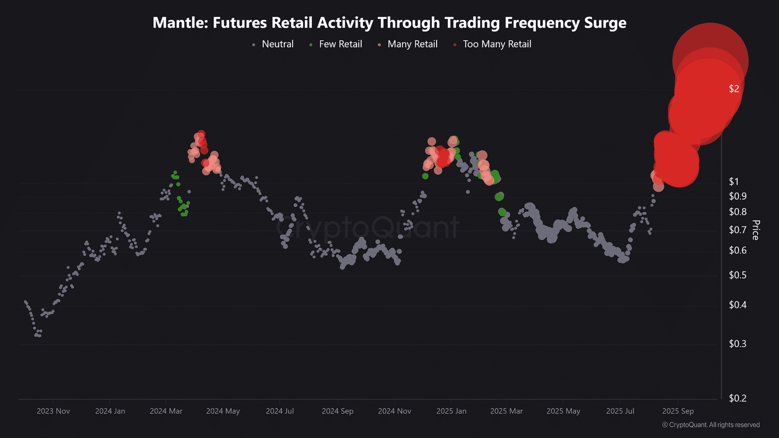 That reading hinted at short-term fatigue, with a possible retracement toward the $2.09 gap before another attempt. However, the long-term outlook remained bullish given Mantle’s expanding fundamentals and retail-driven momentum.