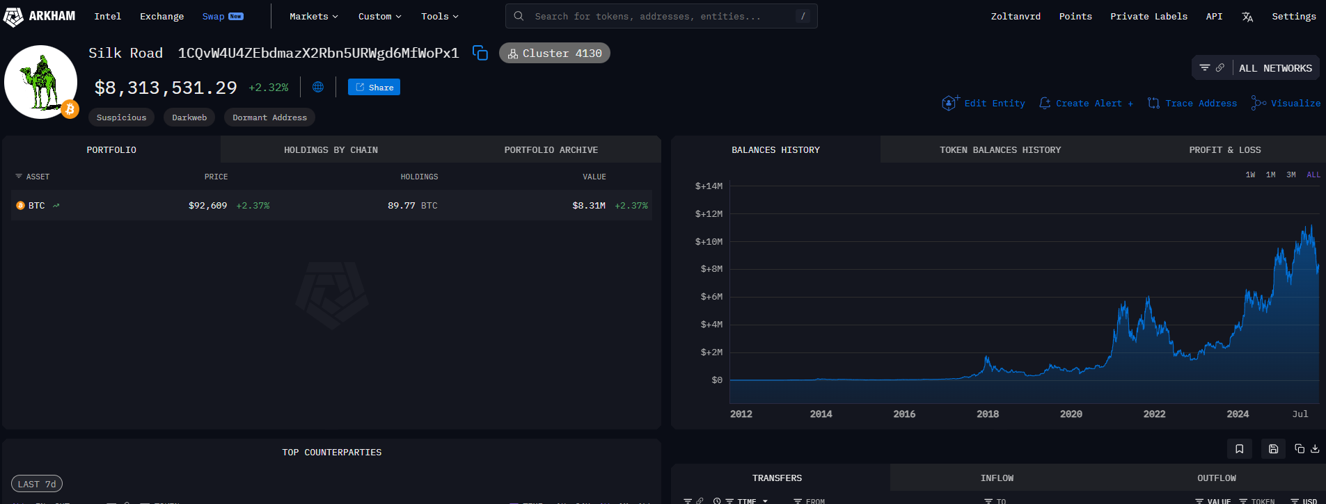 Another Silk Road-branded wallet, likely owned by Ulbricht, contained $8.3 million in bitcoin. With the exception of three small test transactions in the last 10 months, the wallet has been inactive for 14 years, According to To Arkham.
