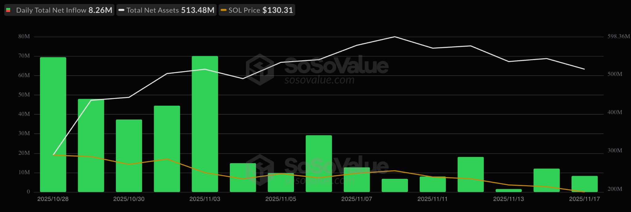 US-based SOL ETFs added $8.26 million on Monday, bringing cumulative inflows to $390 million and total net assets to more than $513 million, according to SoSoValue data.