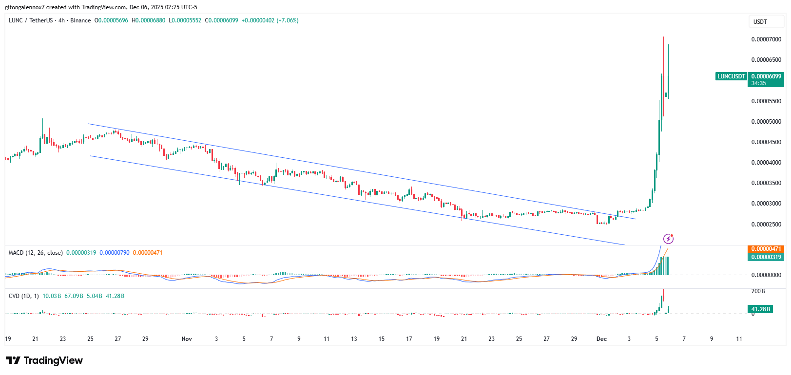 On the charts, LUNC broke above the downtrend channel on the 4-hour chart. The consolidation lasted more than a month before the breakout on the second day of December.