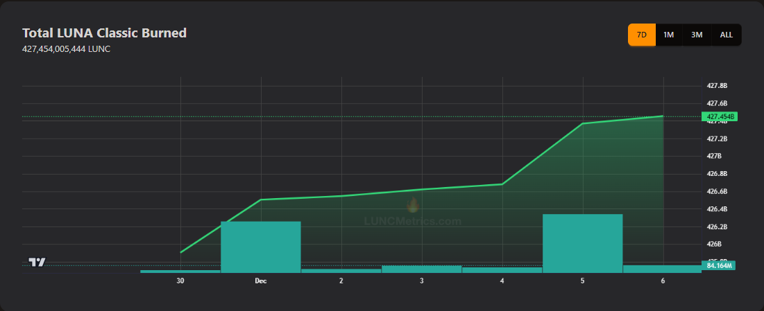 In addition, on-chain activity, especially supply drop, was implemented perfectly. The number of tokens burned weekly has risen to over 427 billion LUNC.
