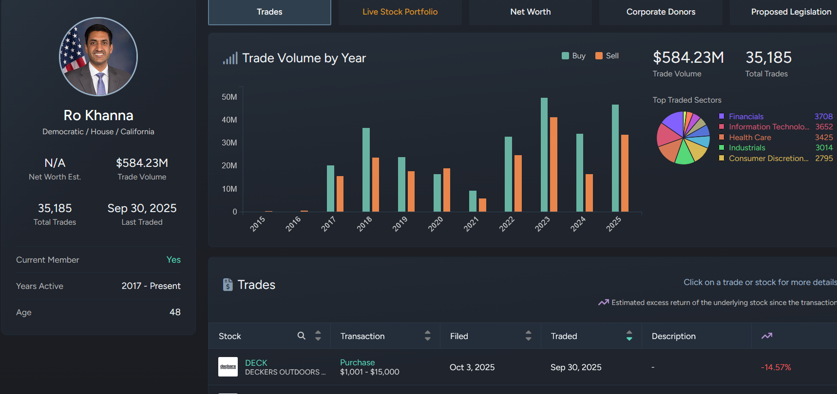 According to data from Quiver Quant, Khanna himself generated $80.3 million worth of stock trading volume in 2025.