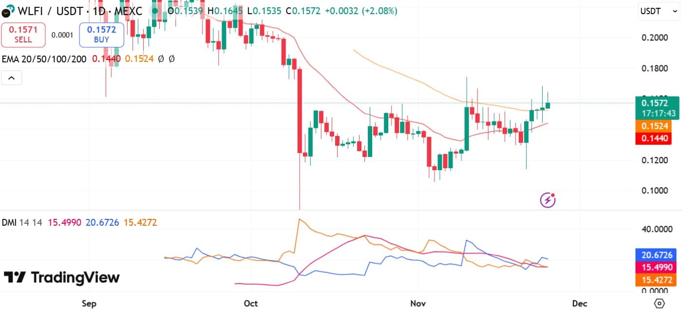 At press time, WLFI was trading at $0.157, up 0.85% daily and 12.3% weekly.